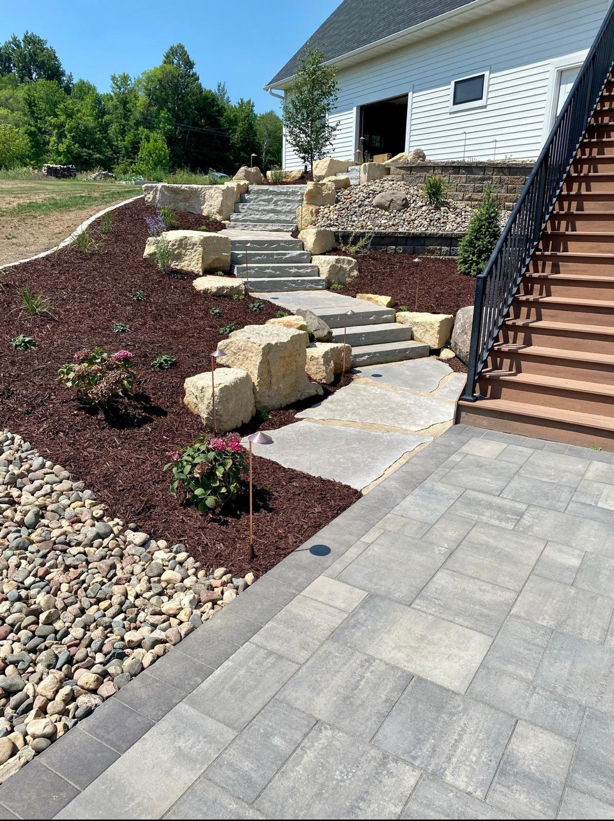 Our rocks and mulch bed planning services are designed to create harmonious and well-organized outdoor environments that maximize both functionality and visual appeal. We believe that thoughtful placement of mulch and decorative rocks is the foundation for creating a low-maintenance, healthy, and attractive landscape. By strategically planning mulch and rock beds, we enhance soil moisture retention, prevent weed growth, and define garden areas, walkways, and borders that align with the client’s landscape design goals.